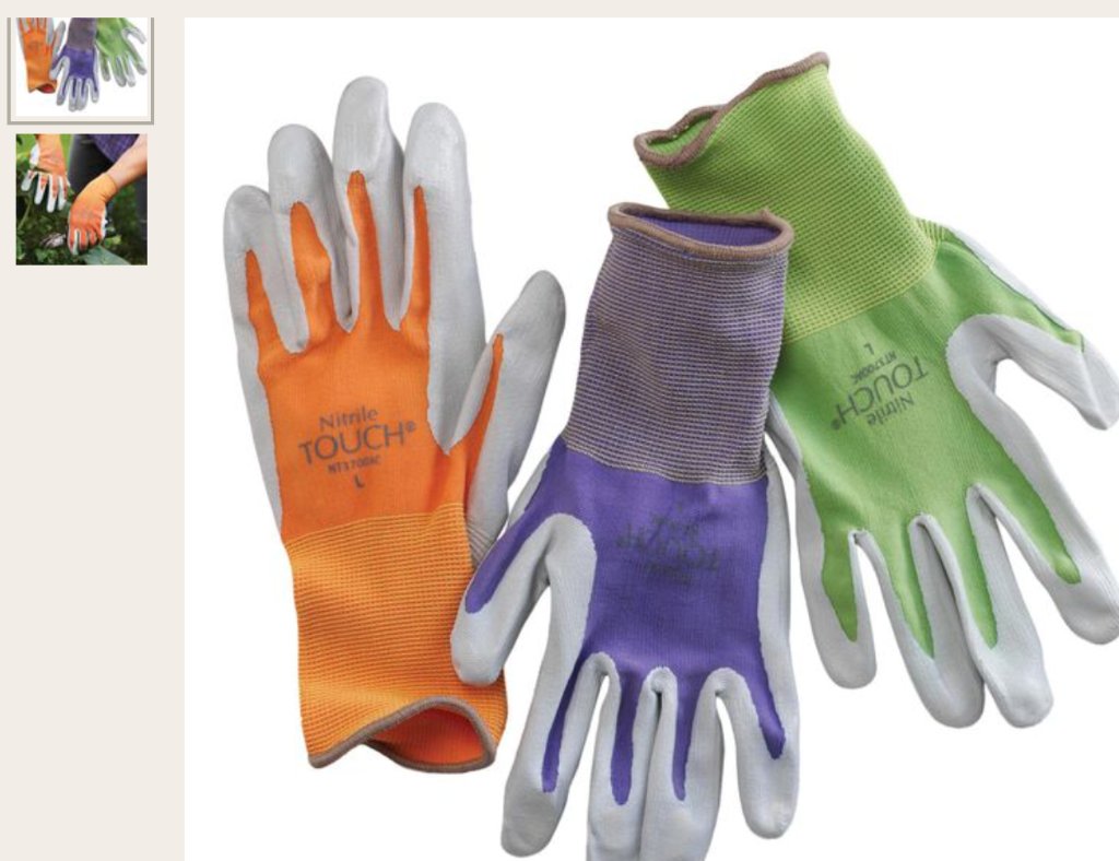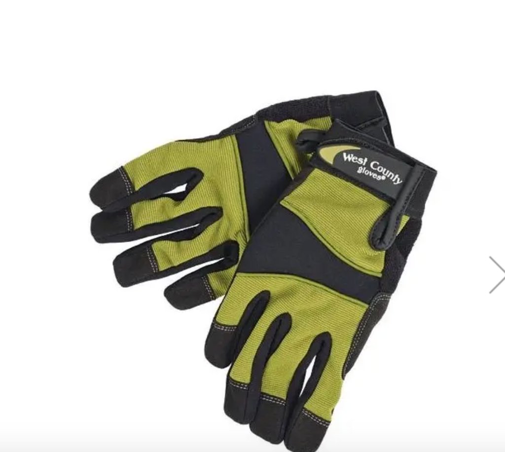 My favorite gloves for real work. West Country Gardening, with reinforced tips, palms and breathable. These are great when cutting trees, roses, working on wood building projects and fencing. The index finger (you know the one that always wears first on your garden gloves), its reinforced. Love these.