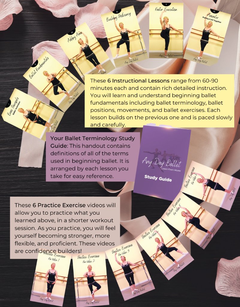 This is a beginning ballet video course and it consists of six 60-80 minute INSTRUCTIONAL LESSONS and six PRACTICE EXERCISE videos each 20-40 minutes long.