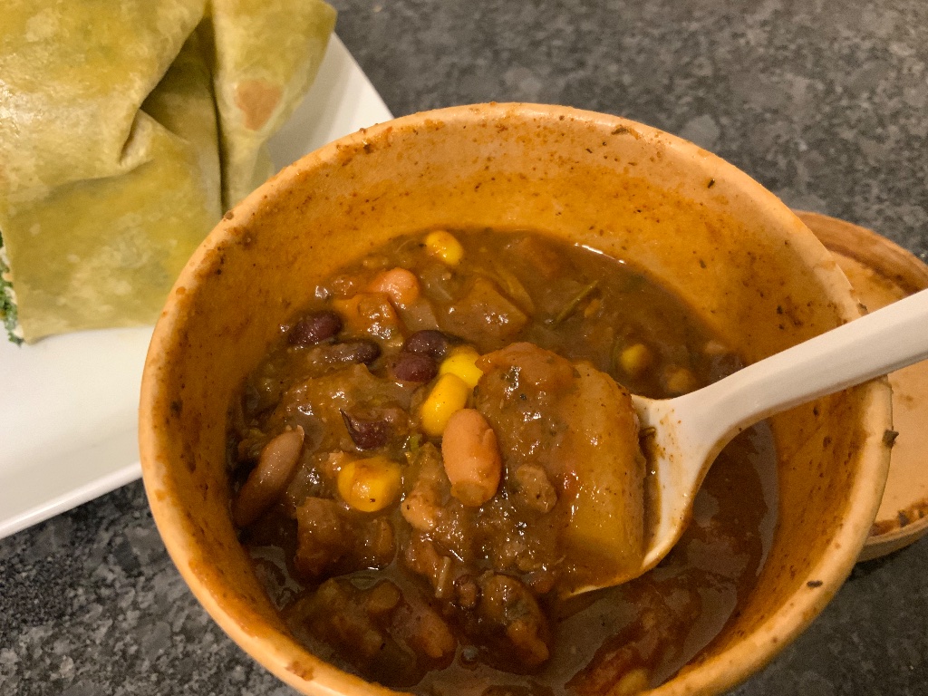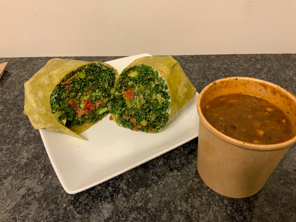 They customized the wrap to my dietary needs (since Acid Reflux doesn’t agree well with the raw tomatoes that come with it) including a mix of spicy and regular fresh kale, avocado, sun-dried tomatoes, and vegan mayo! For me, the HUGE half-size portion was enough to fill me up along with that warm bowl of Chili that i’d never had before. That hearty mix of pinto beans, beyond meat, celery, bell peppers, onions, jalapenos, potatoes, carrots, tomatoes and cilantro was all I needed for this cold extra-long winter.